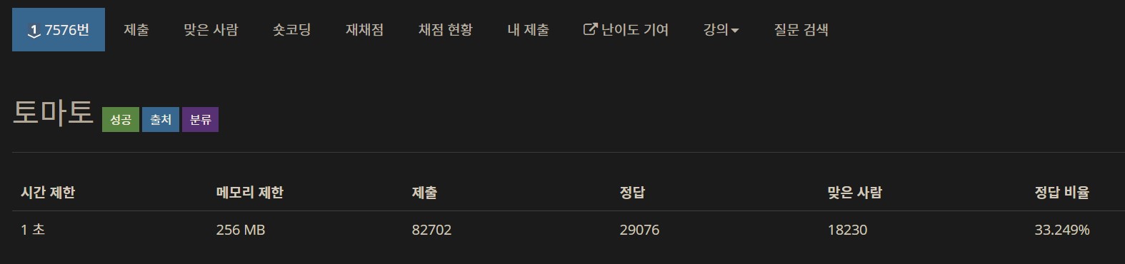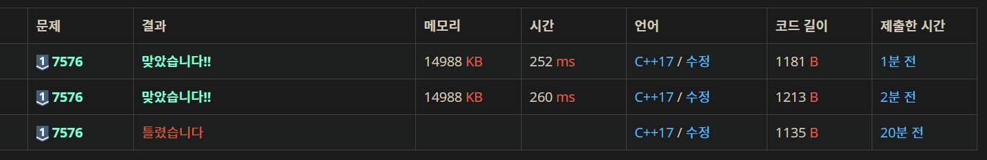 익은 토마토가 있는 칸을, 입력받을때마다 큐에 넣어주고 visit 처리 했습니다.