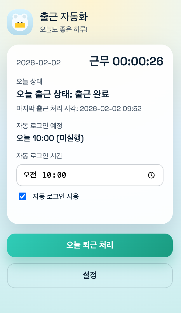 출근처리 버튼을 누르면 번잡스러운 그룹웨어 접속, 로그인, 출근버튼 클릭을 자동으로 처리할 수 있게 구성했습니다.
