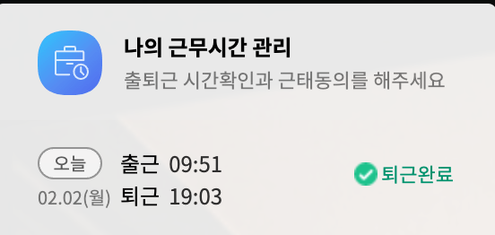 아래와같이 출근 완료 상태와 총 근무시간이 표시됩니다.