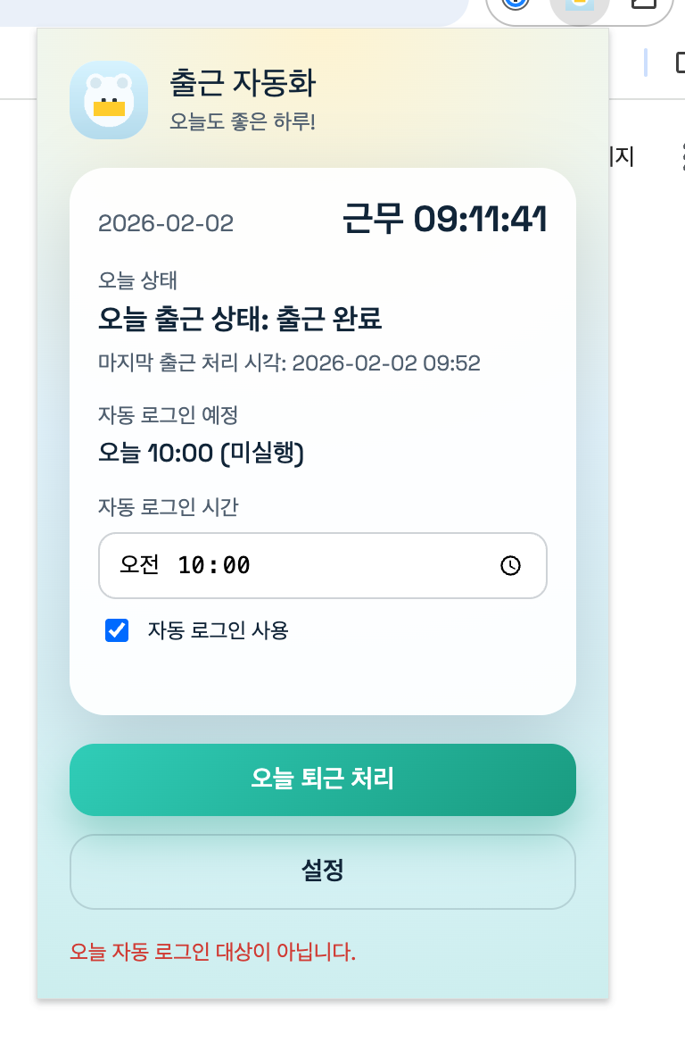 이 프로젝트를 크롬 확장프로그램으로 만들어서 실제 제가 출근버튼을 누르기위해 사용하는 플로우를 재현해주길 바랬습니다.