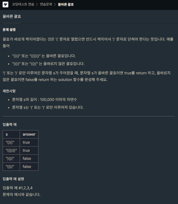 괄호가 바르게 짝지어졌다는 것은 '(' 문자로 열렸으면 반드시 짝지어서 ')' 문자로 닫혀야 한다는 뜻입니다. 예를 들어 "()()" 또는 "(())()" 는 올바른 괄호입니다. ")()(" 또는 "(()(" 는 올바르지 않은